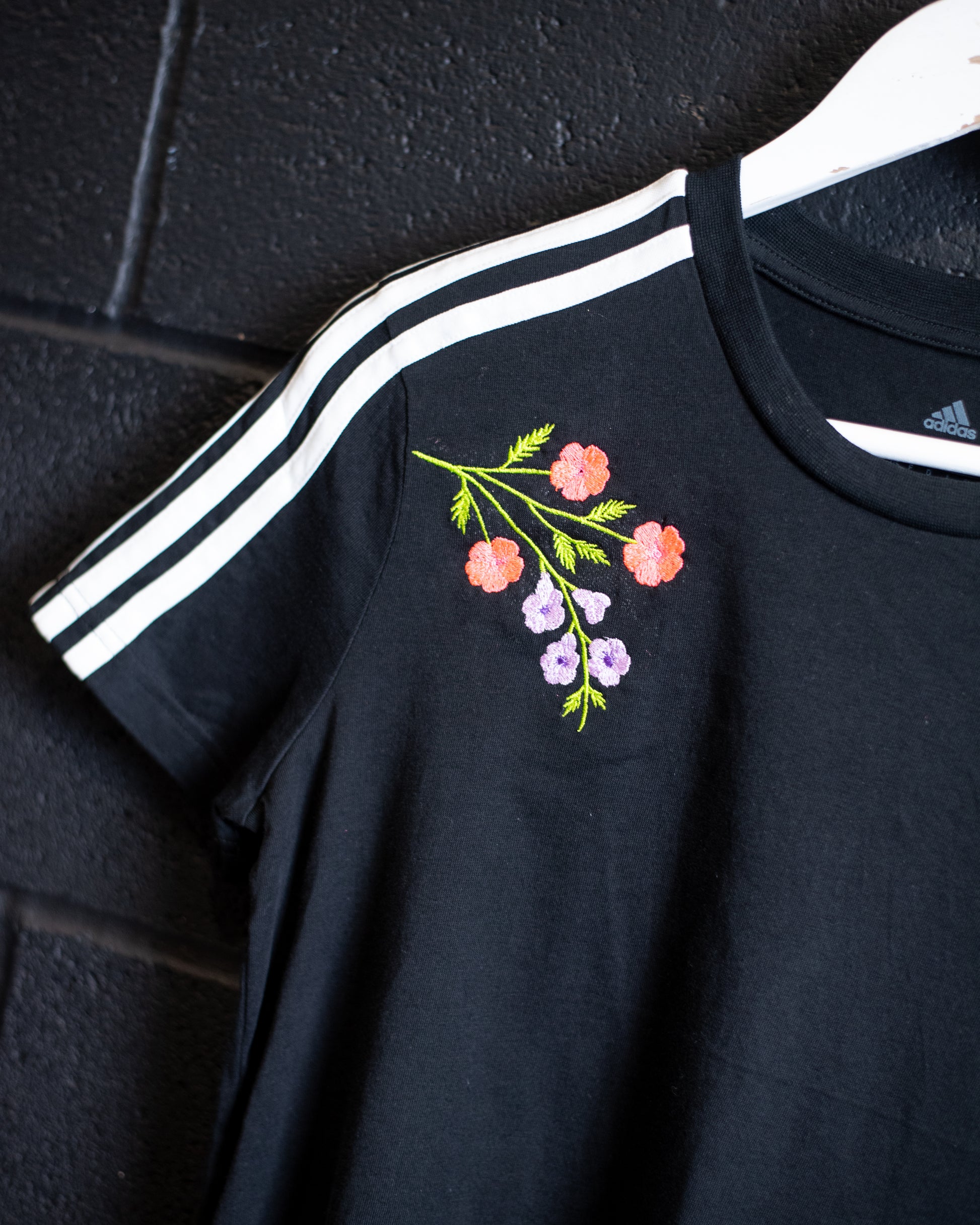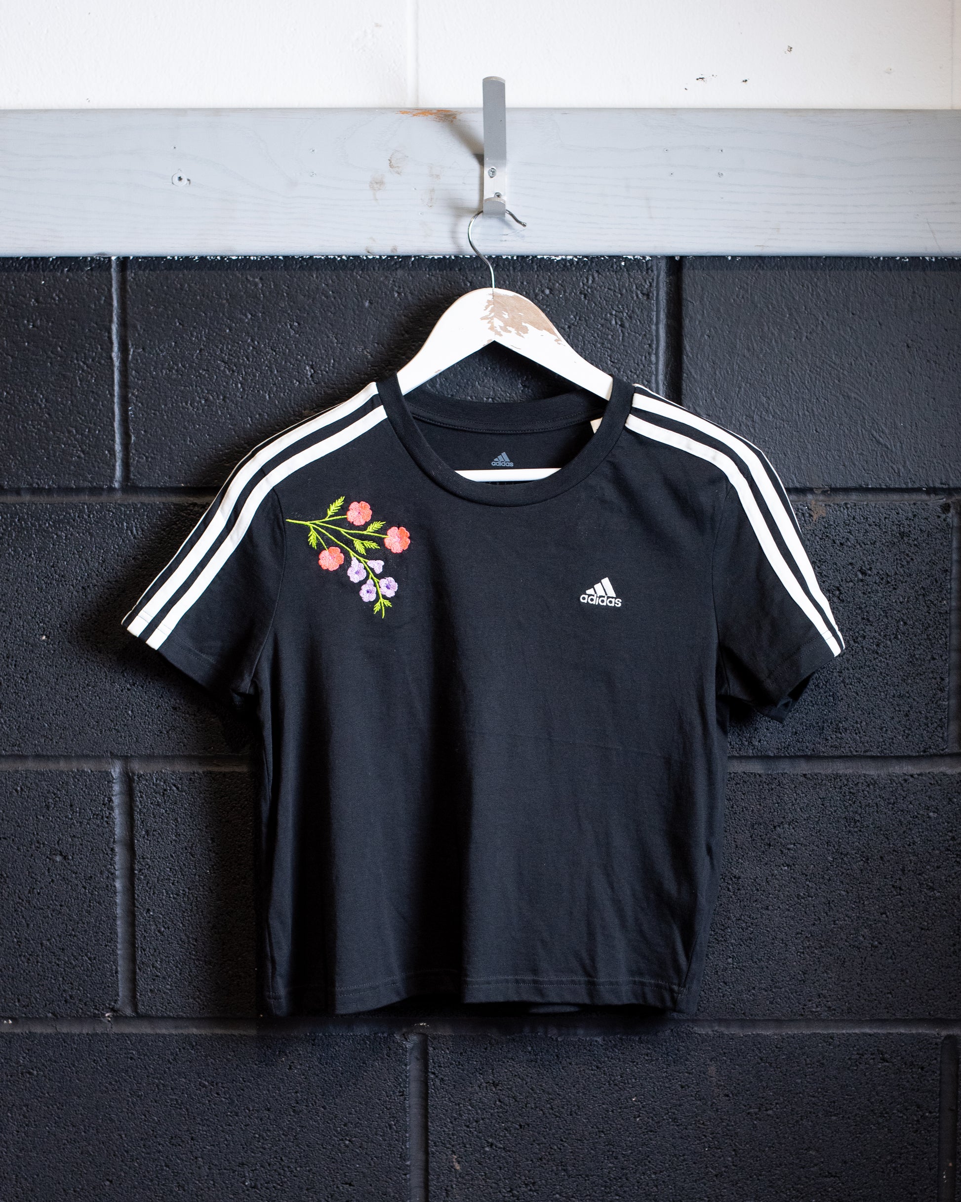 This piece was designed and embroidered by Nat on a single-needle machine. The bright florals bloom across a reworked Adidas crop tee - a mix of sport, softness, and northern soul. I’m thinking rave attire.Â